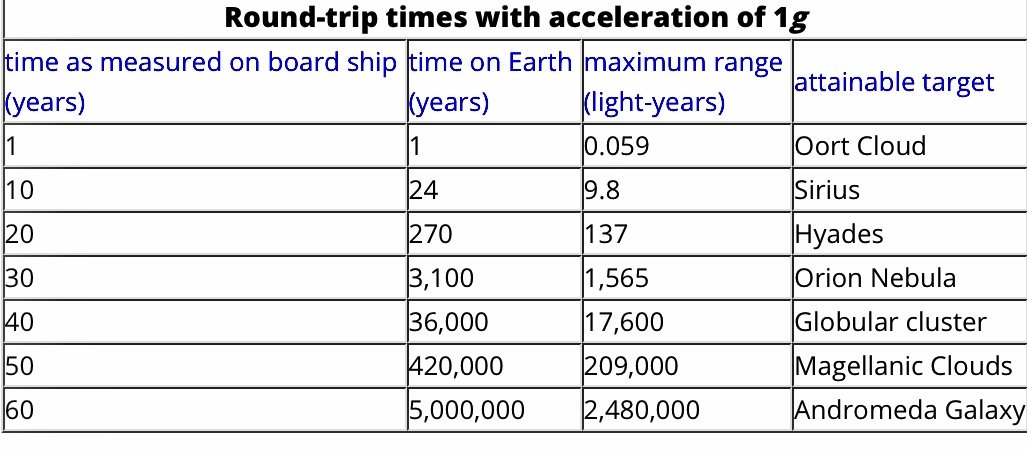 Yeah, nothing we can fathom can actually travel faster than speed of light. The calculations based on a trip traveling at 1 G accelerating first half of the flight and decelerating the second half is what they are seeming to see as the sweet spot. When you get into time dilation due to special relativity it is just mind boggling. With the exception of a few close places, any were else is a one way ticket bc the amount of time passed here means Earth could be destroyed of at the very least humanity. And the crazy thing is most people do not thing about there is a difference between interstellar and intergalactic travel. If we actually were to travel intergalactic at 1G to the closest galaxy to us, Andromeda, it would take 60 years about the craft and 5,000,000 years will have passed on Earth. So you either set off as nomads really vs explorers. Until there is something unbelievably radical discovered, such as how to not only make a worm hole, but control the start and finish to where you want to go. Then you are talking more like stepping through a doorway bc you have literally folded space-time in half. It’s truely mezmoring when thinking about things like this. The flip side is its almost disheartening and really makes it feel as though we are not meant to go beyond our playground. Sorry for the massive ramble session! :)