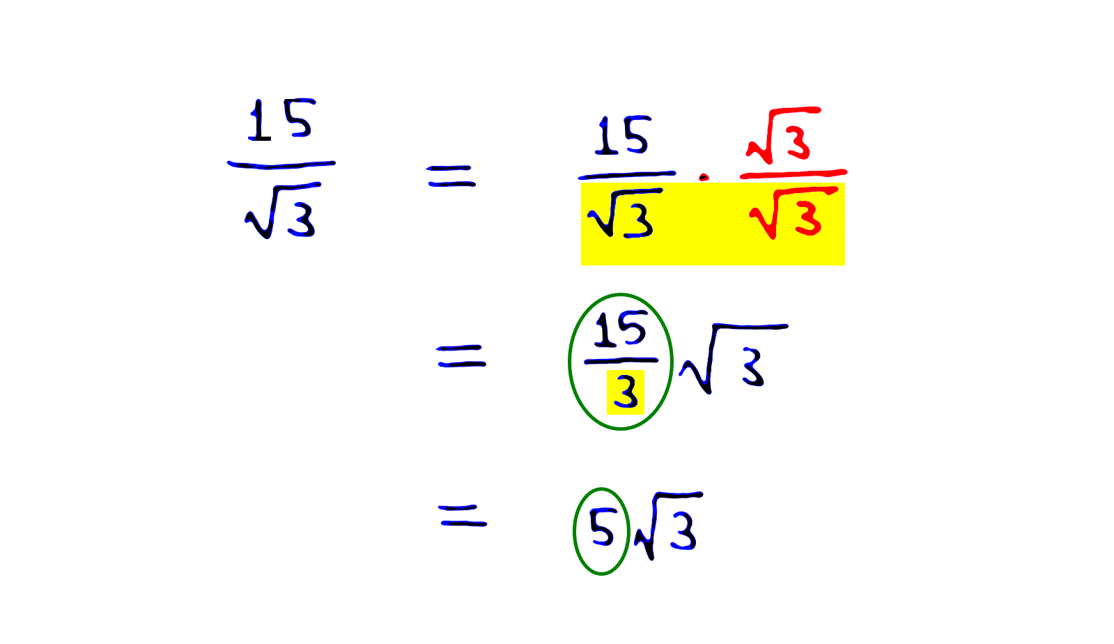 The square root of 3 multiplied by the square root of 3 is 3. Why? Because this is precisely what a square root means! By definition, the (principal) square root of a non-negative real number n is the non-negative number that, when multiplied by itself gives n. After the square roots merge to become 3, we can cancel 15 with 3 to give 5. The last line gives the final simplified answer.