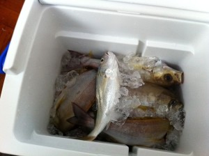 From the diagram , we can assume that the fish tempreture is higher than the ice tempreture .Ice and the fish are contact each other , so when it contact each other the process thermal equilibrium will occurred . The tempreture of fish will drop untill it is equal to the tempreture of ice .The fish contain more heat , then the ice will absorb the heat from the fish . Ice will start to melts as it absorbed the heat from fish .The bigger ice quantity ,the more heat will be absorbed by the ice .