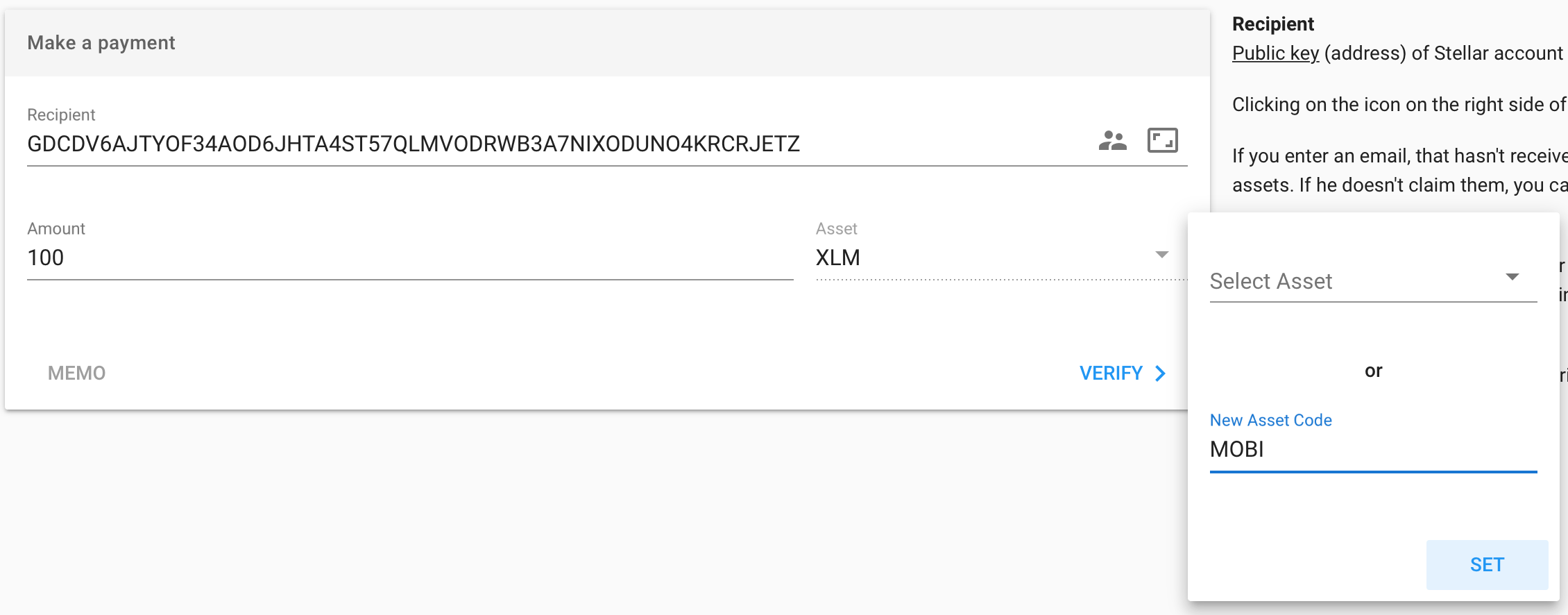 Fill in the Recipient address and Amount of tokens that you want to send. Under Asset click the drop-down menu and then enter New Asset Code: MOBI. and click SET.