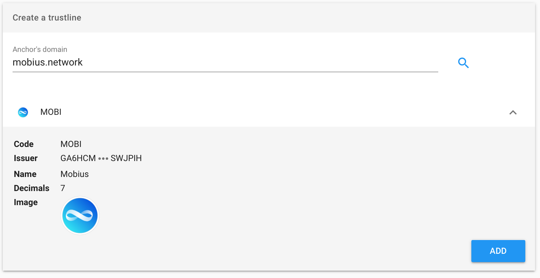 We will take a look at how we can establish a trustline with the anchor mobius.network to receive their token MOBI. Same steps can be followed for all other Anchors and their assets (tokens) that they provide.