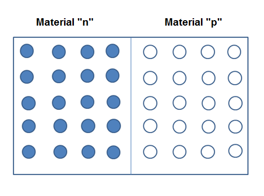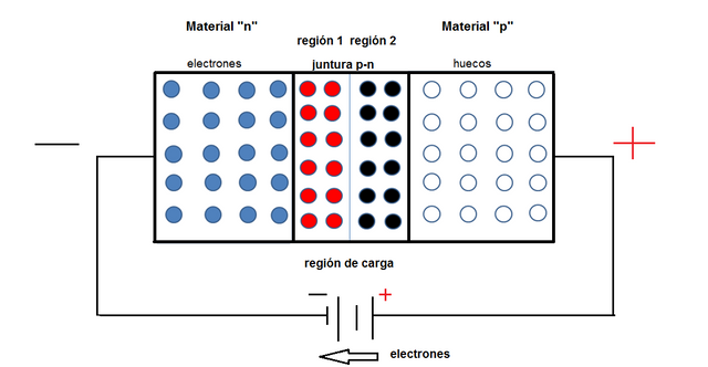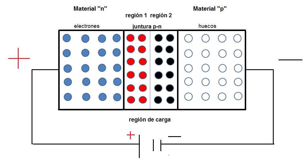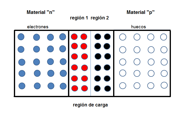 Si tenemos una juntura de material tipo n con material tipo p como se muestra en la figura 1, sabemos que el material "n" esta representado por los "electrones libres", y material p se representa por los "huecos".