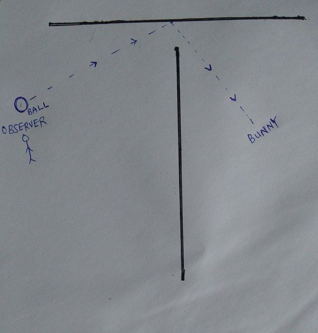 For the device, the ball is the picosecond laser that fires the millions of photons per second. The light follows the same trajectory as the ball, hits the wall and gets deflected onto the bunny, then bounces off the bunny, and back to the wall which deflects it again to the observer. That laser light then received is analysed by some sophisticated algorithms that in turn produces the 3-D image of the hidden bunny.