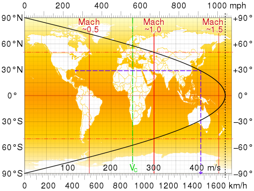 The blue-dash line is the tangential speed of the rocket launch port at Cape Canaveral in Florida which is about 408 meters per second. The green-dash line is the speed of a typical aeroplane at cruise speeds. Notice the tangential speed of Cape Canaveral at 408 m/s exceeds the speed of sound (Mach 1). The speed of sound is 343 m/s in dry air at 20 °C.