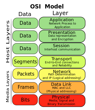 [OSI model protocol data unit (PDU), left and OSI model, right. Image credit: Wikimedia CC3.0 license. Author: Gorivero]
