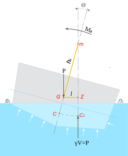 The angle of heel tends to increase by the forces of weight and buoyancy, if M is below G, the equilibrium will be unstable. The transverse metacentric height is the distance from G to M, taken to be positive if M is above G. The stability of a ship under most conditions is designed to be able to overcome any form of restriction or resistance that may be encountered during a heavy storm in the sea, nevertheless, ships possess undesirable roll characteristics when the balance of oscillations in roll is twice that of oscillations in heave, thus capsizing is inevitable