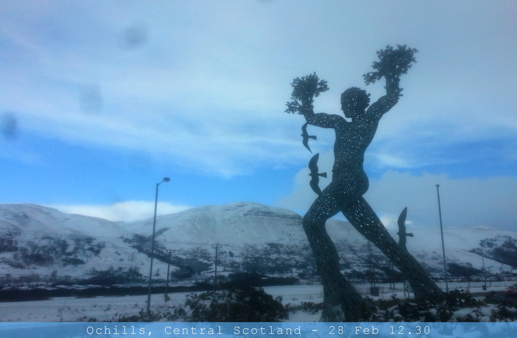 Don't watch news, don't pay attention to forecasts – it changes all the time in Scotland anyway, and they kinda tend to exaggerate in order to cover backsides, and have days off. So off I went to the nearby city – 80km, to see my friend S, as we had arranged some weeks ago. Snow everywhere but no problem with the local Edinburgh bus to the station, the train to Central Scotland, and then the connecting bus to the village by the Ochills. Not much traffic, schools closed, day bright, mood great.