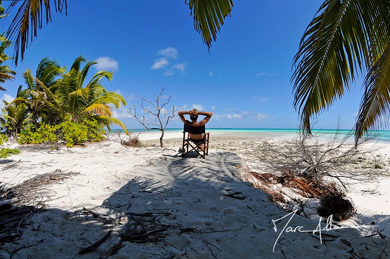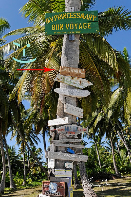 Instead, thousands of coconut trees that only a few cyclones can still bring down twice a century. The place is of a beauty rarely reached. A long beach of perfect sand stretches for a few hundred meters, many coconut trees come all trunks skewed to bring the necessary shade to our hours of rest, the turquoise of the bay contrasts beautifully with the white and green shore. If paradise was an island, it could be called Direction Island. Some long-term sailors are not mistaken and come throughout the trade winds season to anchor and attach their hammock. Joshua Slocum, Bernard Moitessier, Antoine, and many anonymous, now Aurora (!)having marked their passage of signs fixed to some coconut trees, were for a few weeks the privileged hosts of this haven of peace.
