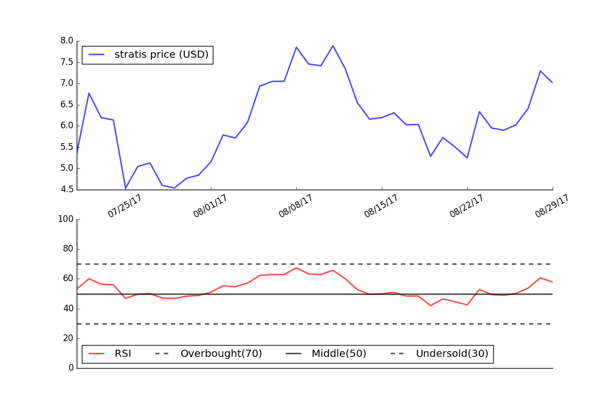 Since the RSI is currently between 30 and 70, this would indicate that Stratis is neither overbought or oversold and that no material price change is expected.