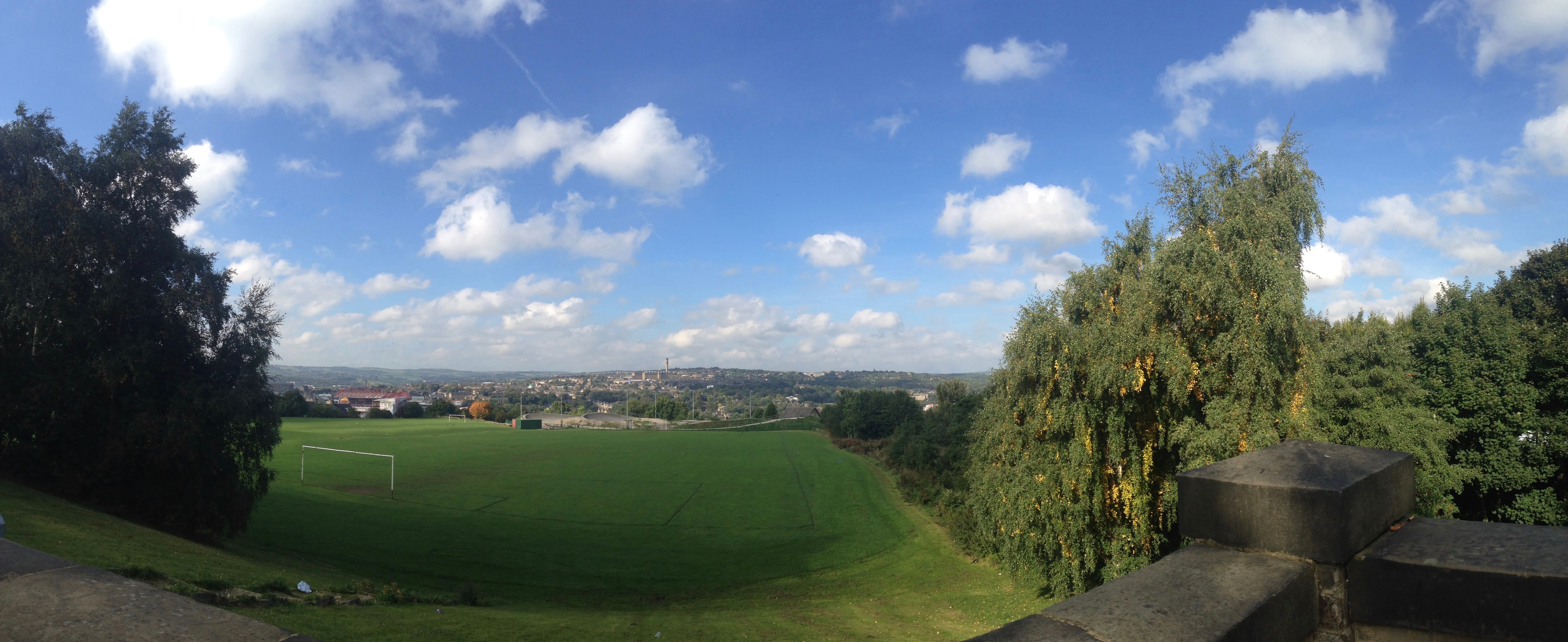 This Panoramic photo from a few years back was taken in Peel Park, Bradford looking out over the Football fields.