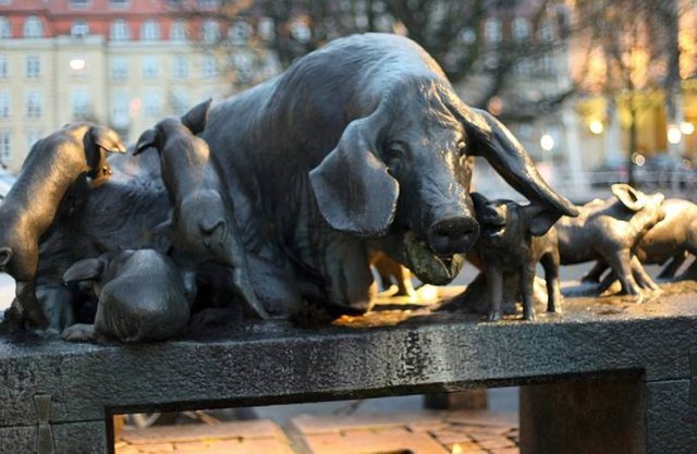 In Denmark, pig breeding is very developed, because bacon is a mandatory dish on the table of every Dane. It is because of such love for this dish and was a monument not to someone, and pigs. And yet the Danes are very lean, and pigs to them as symbols of the economy.