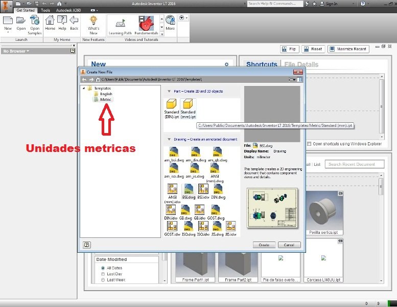 Es importante seleccionar el sistema de unidades con el que trabajaremos ,un ejemplo es si nuestras piezas son milimétricas seleccionamos la opción standar (mm).ipt o si el sistema usado se basa en pulgadas seleccionamos la opción standar(DIN).ipt.