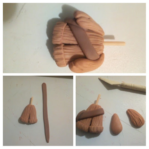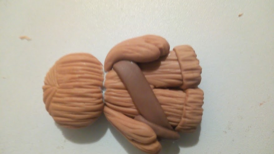 Cuerpo: Con masa marrón realice una gota aplanada, se texturiza, con la tijera se hace una abertura y se forman las piernas.
