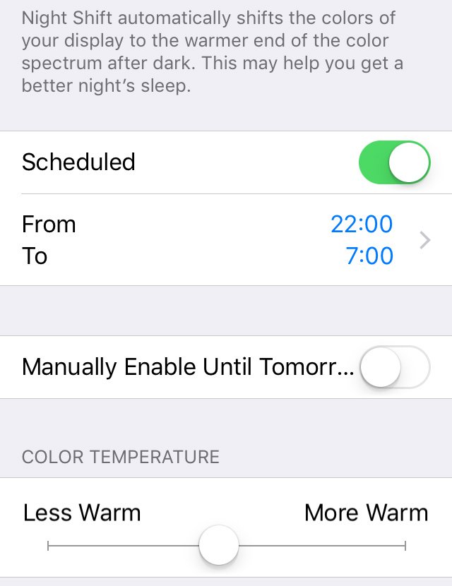 Even at the default medium level the Night Shift mode can help people that love to use their smartphones or tablets when they get in bed before going to sleep. The decrease of the actual level of Blue light perceived by the person using the device the body starts to generate the hormone Melatonin that essentially is responsible for getting our bodies ready for sleep. It is a known fact that our bodies have a stronger response to blue light that essentially prevents them from starting to produce that hormone, though actually any kind of light does have that effect on the production of Melatonin, the Blue one is just the most potent one. Precisely the reason why some people take pills with Melatonin (sleeping pills), so that they can get to sleep easier, but that may not be the best solution to the problem.