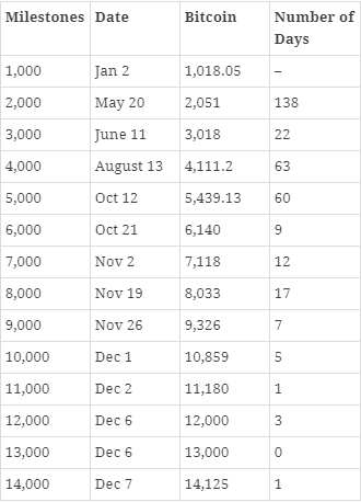 The table shows the amount of time (in days) that it took for Bitcoin to reach major price milestones... 60 Days from $3k to $4k, 60 days again from $4k to $5k.. At this time its apparent bitcoin is on a slow but steadily uptrend, but from $5k things started to heat up.