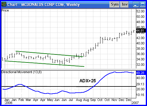 Breakouts are not hard to spot, but they often fail to progress or end up being a trap. But ADX tells you when breakouts are valid by showing when ADX is strong enough for price to trend after the breakout. When ADX rises from below 25 to above 25, price is strong enough to continue in the direction of the breakout.