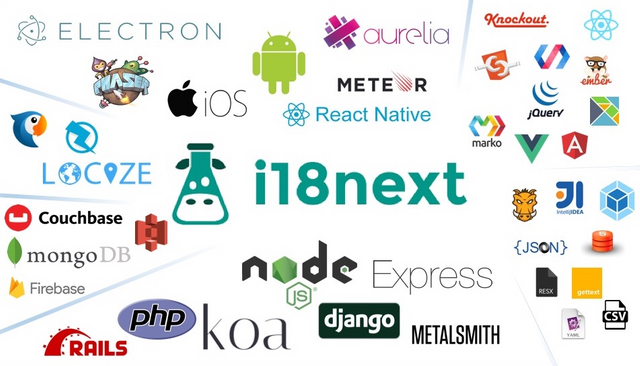 - js, react-i18next, ng-i18next, vue-i18next, jquery-i18next, loc-i18next, aurelia-i18next, i18next-meteor, django-18nxt, node.js, express, electron, react-native, ios native, android native, expo,…