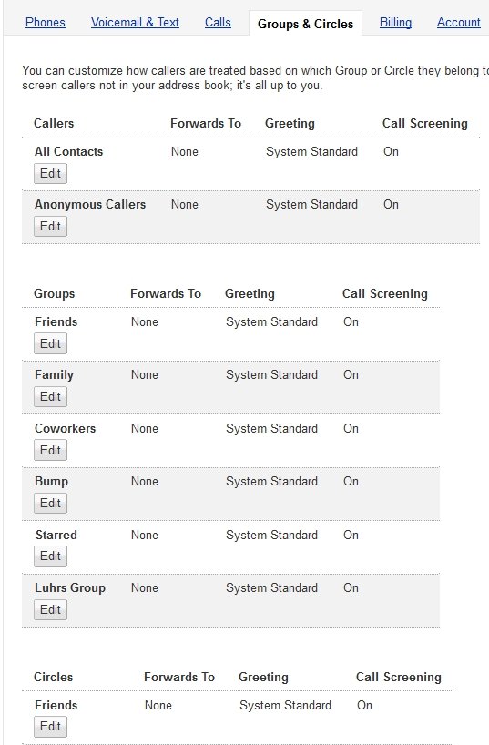 The Groups and Callers section is where the real power of GV is held. This is the area where you can change where specific calls from specific people or groups are routed to.