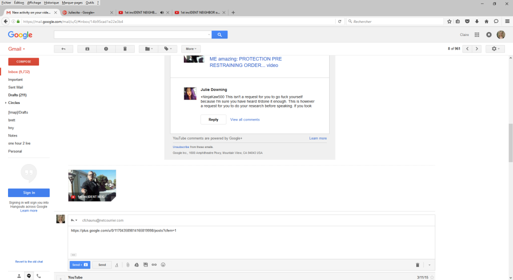 His daughter Julie Downing whom I had also reported to police as possibly been following me since 2011 as I went to LA to see me lawyer defamating me. I met her like once. She literally comes in to validate her psycho dad because she's a paid Piranha contractor as well. What a horrid person. Just saying.