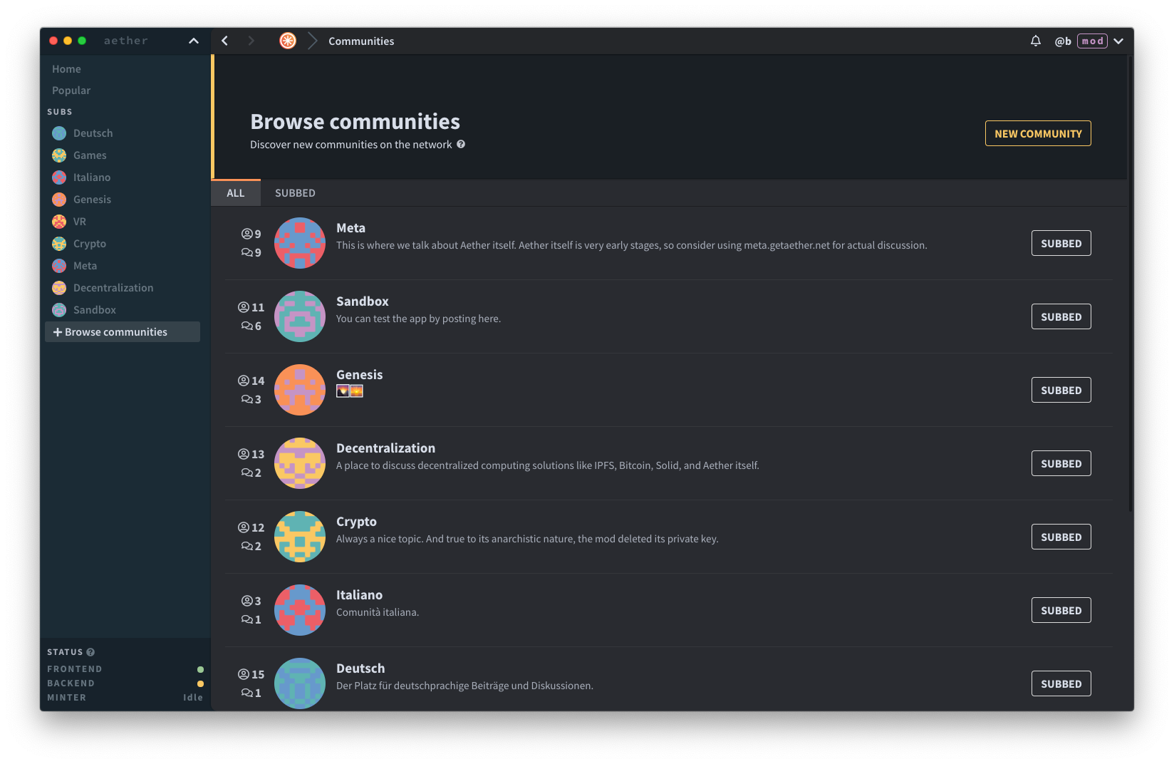 Aether has been created by a former Google and Facebook product designer and engineer, Burak Nehbit, with the goal to create a privacy aware, censorship resistant but still moderated decentralized social network. It is an Open Source application available for macOS, Windows and Linux.