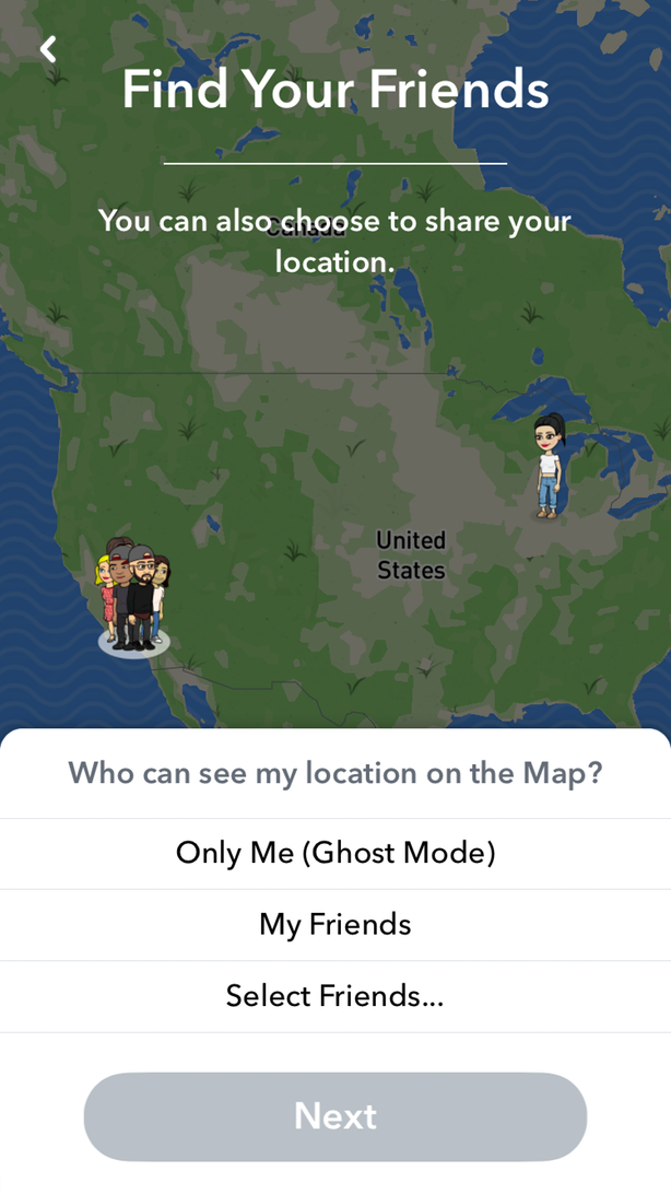 To use Snap Map, you'll need to set up your location preferences. A note here: If you don't want other users knowing your location, you'll want to stay in "Ghost Mode." If you only want your friends to know where you're posting from, toggle into the "My Friends" setting. And if you only want select people to see your whereabouts, select the "Select Friends" option. Pick your pleasure, then hit "Next."
