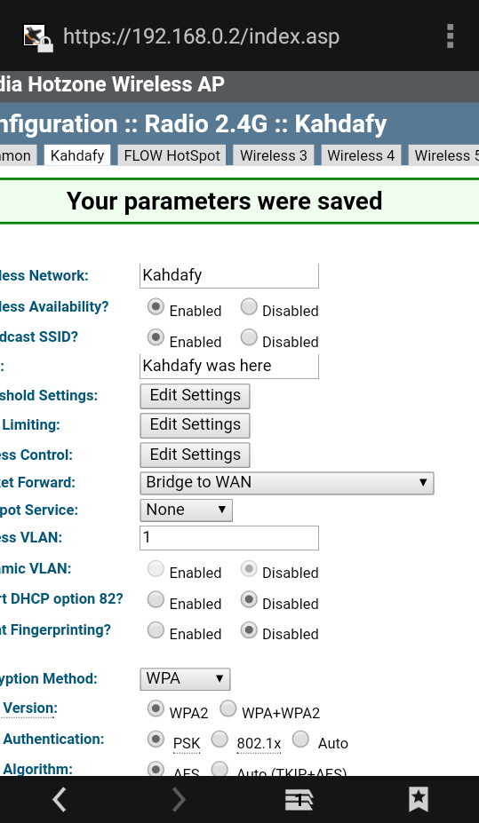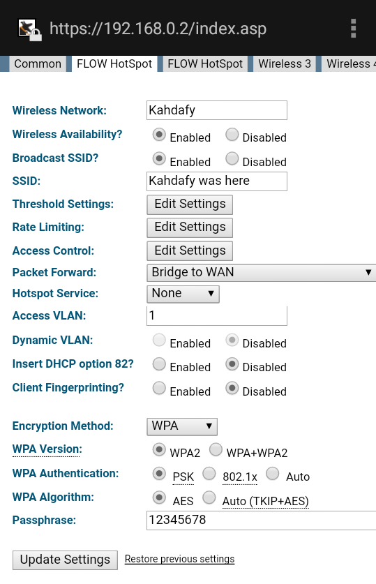 As it turns out they are still on the default user name and password. This is a practice that I see happen a lot. People apparently are not that informed when it comes to Cyber Security. It happens… So basically I was able to get full access to the access point and do whatever I wanted to the network. In a show of demonstration over my newly acquired power over their network I decided to hi-jack the Wi-Fi and make it my own.