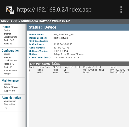Well, well, well…. Yes, I find numerous open ports on the device including http on port 80. Now it is time to see if I can exploit that so I open the web browser and type in the ip address of the device.