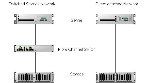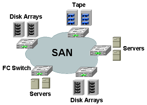 Storage resources include disk arrays, tape drives, and libraries with Fibre Channel interface. The disc can perform data replication over networks between through the Fibre Channel set, and tape libraries can implement the transfer of data to tape directly from the disk array with the Fibre Channel interface, bypassing the network and servers (Serverless backup).