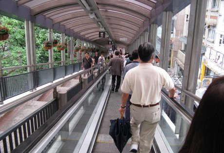 The escalator runs along expensive shops, restaurants and cafes. It was built in 1994. Since that time, it carries about 60 thousand people every day.