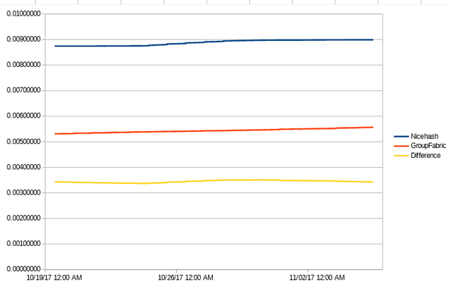 GroupFabric's Bitcoin Miner has earned 0.00025482 BTC while Nicehash has earned 0.00024964. GroupFabric has paid out twice, with a third scheduled for tomorrow, and Nicehash has no payout in sight.
