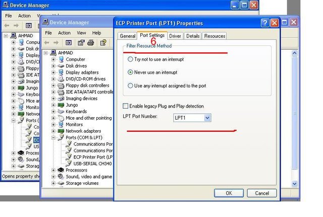 2) Windows xp + sp2 and we choose control panel then system then hardware then device manager then Ports (com & lpt) then printer port lpt1 then pressing the right mouse button and choosing properties and then choosing port settings and make sure never use an interupt Selected