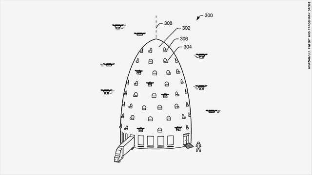 Well, one idea is an airborne warehouse 45,000 feet in the air that just floats around the city. Like a blimp that is stocked with drones. Amazon actually got this patent approved in April of 2016 and imagines a baby blimp to transport the drones to the papa blimp 8 miles in the sky. Drones only have about 30 minutes of battery so that's why the baby blimp is even in the picture.