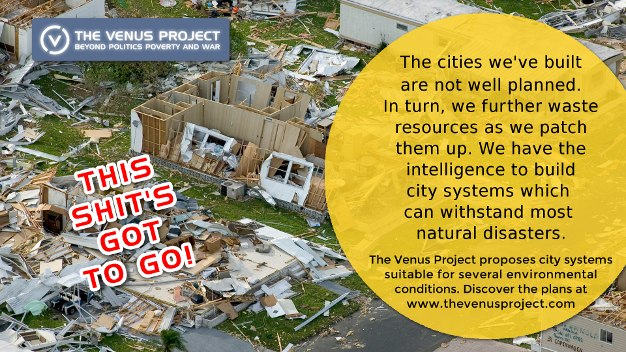 But for the money, we have all we need to intelligently design and create energy efficient, natural disaster resistant cities. There is no need to patch and rebuild using methods which fail to address weather extremes. With a Resource Based Economy, we are free to use advanced technologies to produce much safer and more convenient cities.