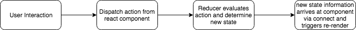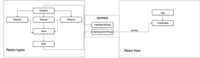 The connect function takes in two functions called mapStateToProps and mapDispatchToProps. mapStateToProps and mapDispatchToProps in the connect closure are granted access to Redux state and dispatch. The connect function acts as an API between Redux and React. The data flow under React/Redux architecture looks like this: