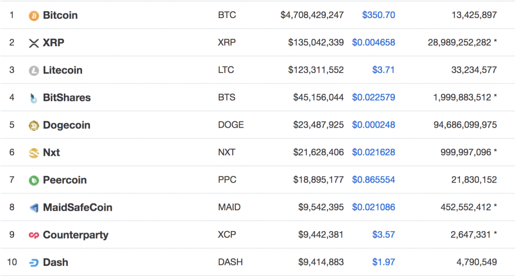 2014년 10월의 암호화폐 탑 10을 보면, 당시, 알트코인은 최하였습니다. 완전바닥이었죠. 게다가 몇몇은 거의 사라질 정도로 바닥을 치고 있었습니다. 당시의 비트코인 가격은 350달러이었고, 리플은 0.004달러였죠. 1센트도 안했네요. 또한 라이트코인은 3.71달러였습니다.