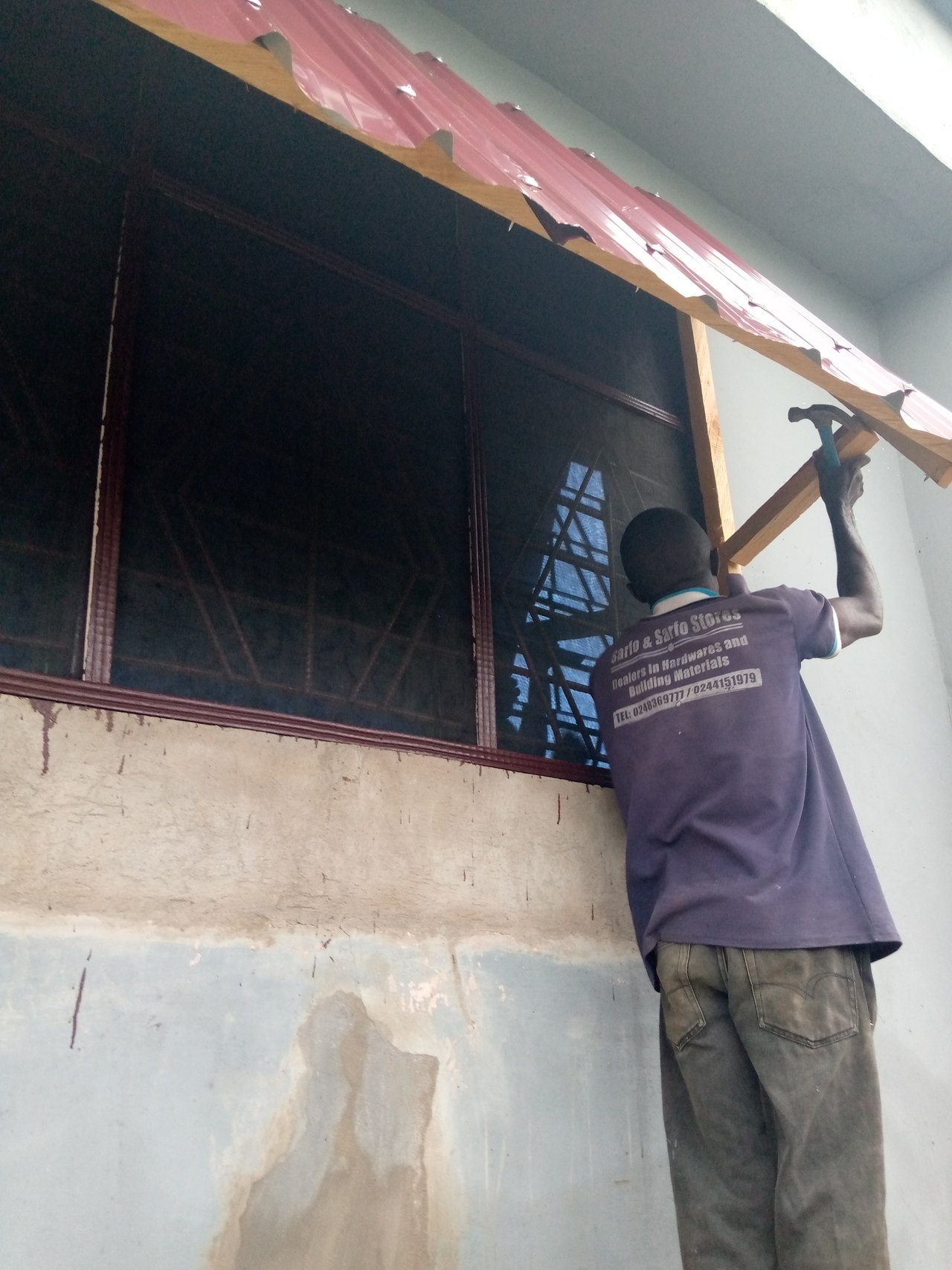 I helped him to lift the structure and fix it on the window frame. He finally nailed it to be fastened with the window. This is how he did it for me: