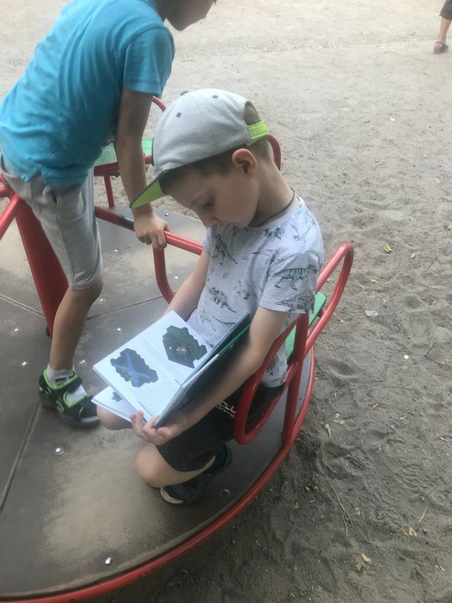 Сегодня с ребенком гуляла жена. Прислала мне фото с детской площадки. Ахахах, Тихон взял у мальчика книгу про свою любимую игру.