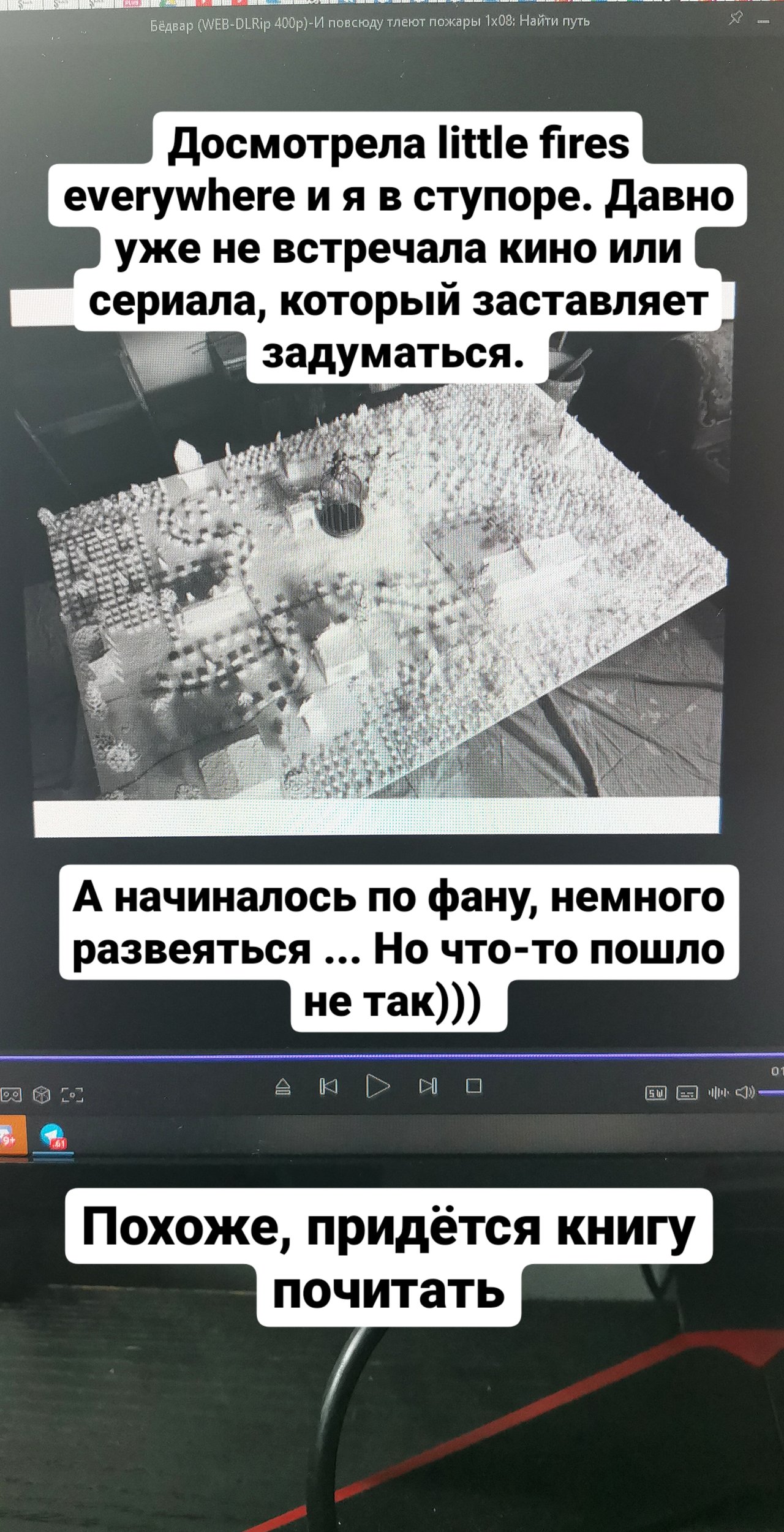 Вчера досмотрела сериал "И всюду тлеют пожары" с Риз Уизерспун. Начинала смотреть по фану - зацепил трейлер, который случайно увидела в сети, понравился анонс... Но по факту оказался очень неоднозначный сюжет, который держит в напряжении всю вторую половину сезона. И фан плавно перетекает во что-то большее. Хоть сериал и состоит всего из 8ми серий - ощущение, что ты сам лично прожил жизнь каждой стороны. Не буду пересказывать сюжет, но посмотреть советую. Начинаешь переосмысливать свою жизнь и сравнивать себя с героями, ставить себя на их место. Искать ошибки, которые есть (или которых нет) в твоей жизни. Что лучше? Отказать от мечты и в стабильности встретить старость? Или рискнуть всем и жить так, как мечтаешь? Думаю, ни у кого нет ответа на этот вопрос...