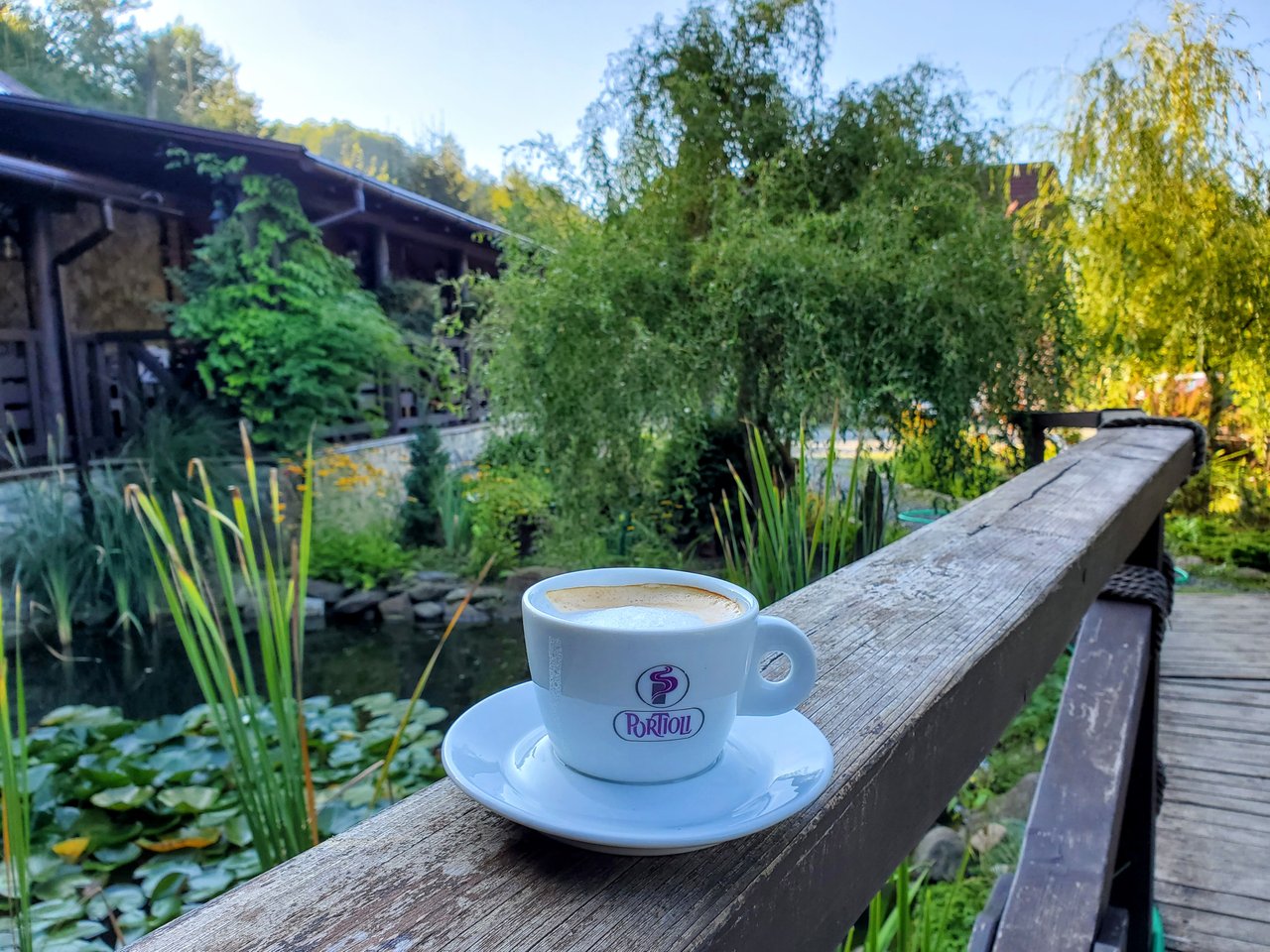 Панорама дворика Ужгородського замку та кава, подана разом із стравою в червоній тарілці, Все так добре зафіксовано.