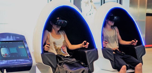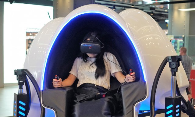 Now, I've been on many simulators before, but never a VR one with goggles. I was curious to see just how far VR had come in the last few years. This system which appears to originate out of China includes a moving capsule in which you sit, a VR headset and a virtual movie of your choice.