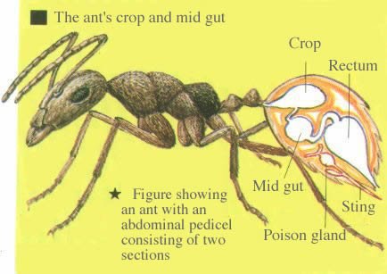 Looking at the above anatomy of the ant there is the Crop which I will call it the "community stomach". This part of the stomach is for storing food to share with other ants. Then Mid gut I will call it a "personal stomach", which is the actual stomach for the ant.