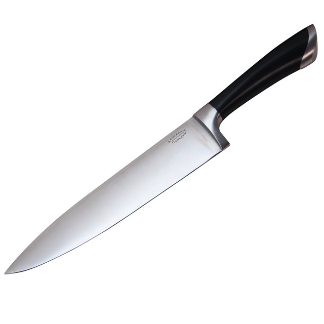 Excellent for meat, fish, and vegetable preparation, this particular knife has a wide blade to scoop chopped food and a curved end to help the rocking motion when chopping.Chef's Knife