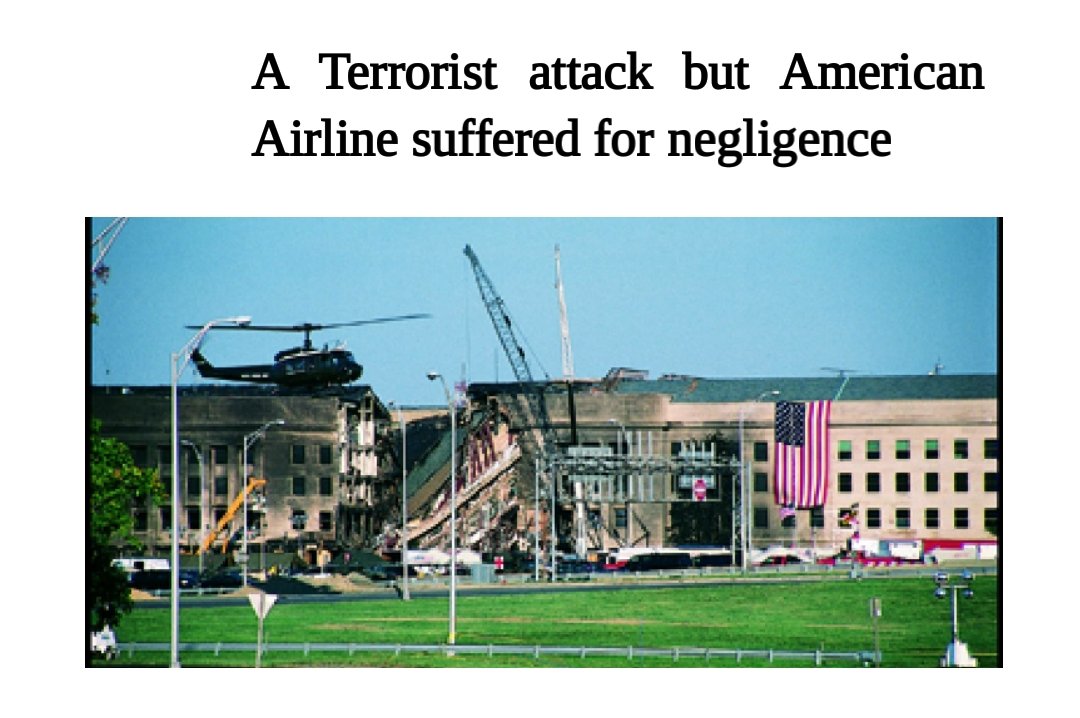 What do we make of this? Is the law blind? I thought the incidence was reported as a terrorist attack. How come the American Airline and not U.S security forces are at the end of the negligence blame if there had been signs the act of terror would be manifest? I asked all these questions because an investment bank which lost 75% of its employees in 9/11 sued American Airlines for negligence in allowing terrorists on board, and won $135 million. Do you smell rat too?