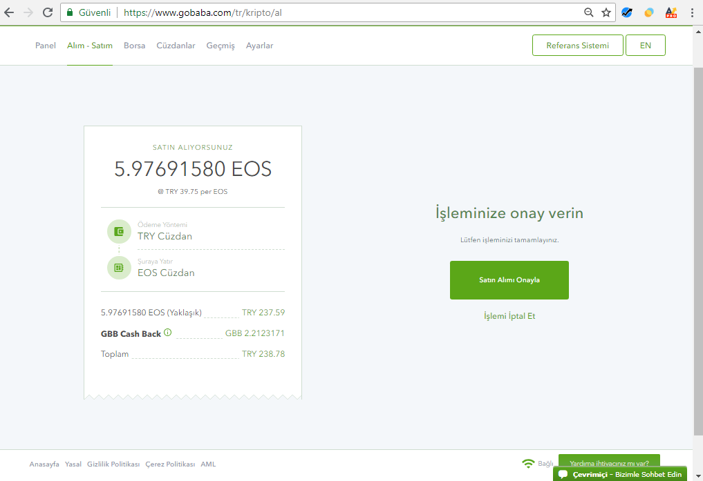 Gobaba hesabıma daha önce TL yüklemiştim. Piyasanın düzelmesi ve birkaç inceleme yaptıktan sonra güvendiğim bir altcoin olan EOS coin aldım. Bu bir yatırım tavsiyesi değildir. Yaptığınız işlemlerden kendiniz sorumlusunuz.