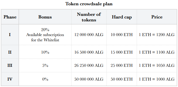 - aşama: Bonus:% 10 olarak belirlenmiştir ve fiyatı 1 ETH = 1100 ALG dir. hardcap 15 000 ETH olarak belirlenmiştir.