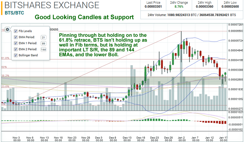 ON THE OTHER HAND, everything is relative, and especially so in this case. The fact of the matter is that in BTC terms, both STEEM and BTS are in the buy zone: perfectly normal pullback areas where smart bulls load up. In BTC terms, neither STEEM nor BTS have “crashed”. USD terms aside – and indeed the losses have not gone unnoticed there – it’s not USD that we are competing against here: it’s BTC and the other old era crypto accompanying it that we are measuring ourselves up to.