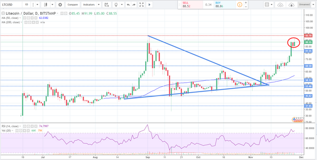 After monitoring Litecoin for the past week our target price of $83 has been met! LTC is now trading around $89. That's a 33% profit!