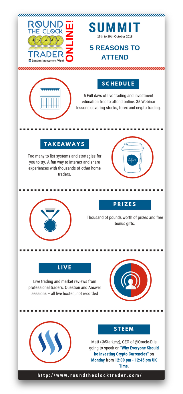 Hello Friends, Today I am going tell you about a group that is '[Round The Clock Traderhttp://www.roundtheclocktrader.com/about-us/)' and their mission is to educate people like traders and investors. There is an upcoming webinar for the all type of traders and investors and that is UK’s largest online trading conference. It is held online from Monday, 15th October to Friday, 19th October 2018.