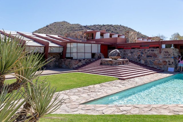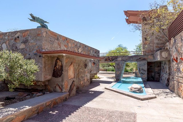 Frank Lloyd Wright’s Taliesin West used to be situated somewhat out of town. But the city of Phoenix has grown in the intervening years, so it is now nestled into a hillside in the affluent suburb of Scottsdale.There were surprises around every corner with interesting rooms, theatres and gardens throughout. We sat in some rather fancy origami chairs, but sorry, no photos of that. The rules were no photos in the living room/bedroom and the chairs were super comfy, so we didn’t want to get kicked out. We did take several photos outside and in other areas though: