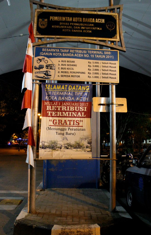 GATE BUS TERMINAL TYPE A BANDA ACEH. On banner written, Starting January 1, 2017, Free Terminal Retribution. Waiting for new regulations (no new regulations until the mayor has changed). Entrance to this terminal is free, no need to pay a dime. All picture taken by Canon EOS M2 Camera, Monday, August 7, 2017.